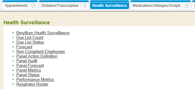Panels can be found, tracked, and displayed in the Health Surveillance module of the chart. This allows for easy tracking and follow-up. Panels can also be used to document regularly scheduled voluntary health screenings, or checkups, and can be configured according to location, if necessary.