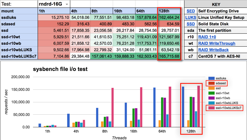 Based on benchmarking findings, it is clear that SSD is faster than a 7200 RPM hard disk with SED. At 128 threads, the SSD with LUKS AES-IN is 261 times faster.